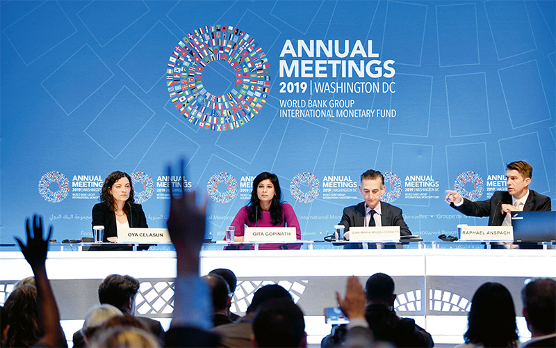 2019年10月,國(guó)際貨幣基金組織(IMF)發(fā)布《世界經(jīng)濟(jì)展望》報(bào)告指出,受一些國(guó)家貿(mào)易壁壘上升、貿(mào)易和地緣政治不確定性增加等因素影響,全球發(fā)達(dá)經(jīng)濟(jì)體和發(fā)展中經(jīng)濟(jì)體的經(jīng)濟(jì)增速同步放緩。IMF將2019年全球經(jīng)濟(jì)增速預(yù)期下調(diào)至3%,降至2008年國(guó)際金融危機(jī)以來(lái)最低水平。但I(xiàn)MF總裁格奧爾基耶娃表示,中國(guó)經(jīng)濟(jì)增速仍位于目標(biāo)區(qū)間內(nèi),對(duì)世界經(jīng)濟(jì)增長(zhǎng)的貢獻(xiàn)率超過(guò)30%。圖為10月15日,IMF首席經(jīng)濟(jì)學(xué)家吉塔·戈皮納特(左二)就最新發(fā)布的《世界經(jīng)濟(jì)展望》報(bào)告出席新聞發(fā)布會(huì)。 新華社記者 劉杰/攝