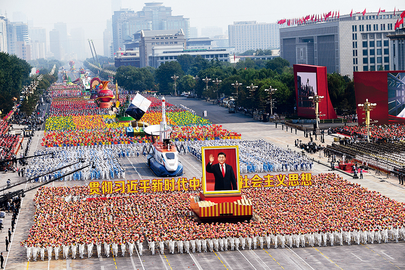 2019年10月1日上午,慶祝中華人民共和國成立70周年大會在北京天安門廣場隆重舉行。圖為“偉大復興”方陣經(jīng)過天安門廣場。 新華社記者 徐昱/攝