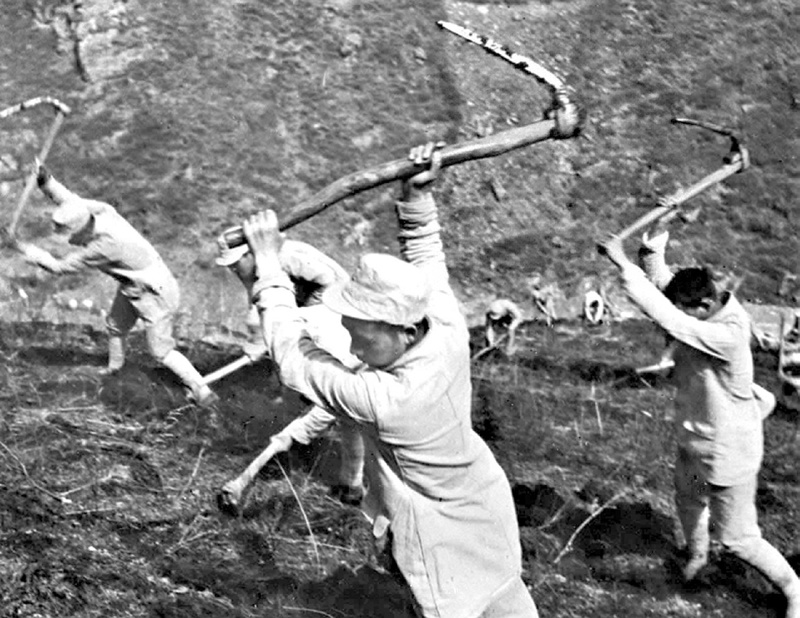1941年前后,由于日本帝國主義的“掃蕩”和國民黨反動(dòng)派的封鎖包圍及自然災(zāi)害,各抗日根據(jù)地出現(xiàn)了極端困難的局面。中國共產(chǎn)黨提出“發(fā)展經(jīng)濟(jì),保障供給”的方針,開展了大生產(chǎn)運(yùn)動(dòng)。圖為晉察冀邊區(qū)的八路軍指戰(zhàn)員在開荒生產(chǎn)。 新華社發(fā)