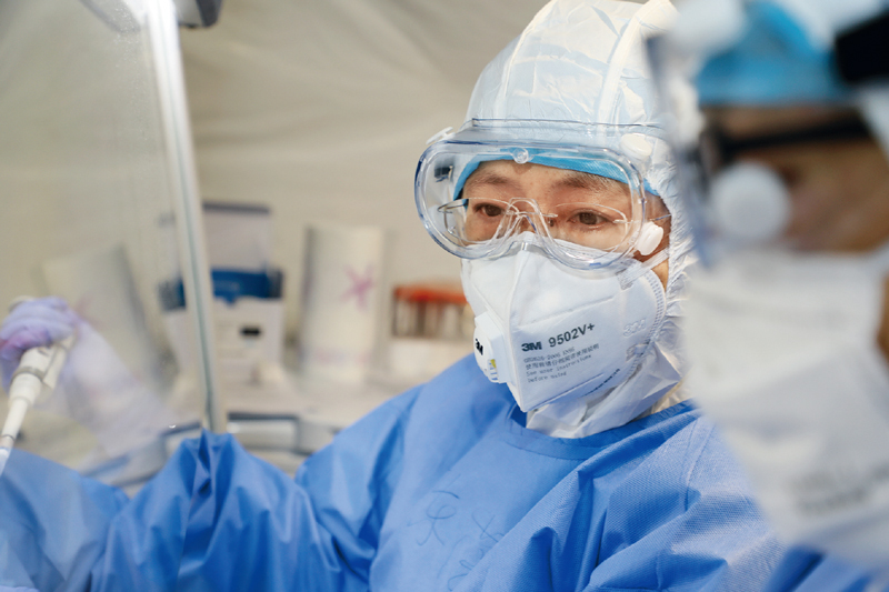 中國工程院院士、軍事醫(yī)學(xué)研究院研究員陳薇,曾在阻擊非典、抗擊埃博拉等多場硬仗中作出重要貢獻(xiàn)。今年農(nóng)歷正月初二,她就帶領(lǐng)專家組緊急進(jìn)駐武漢,全力進(jìn)行科研攻關(guān)。2020年3月16日,陳薇團(tuán)隊(duì)研制的重組新冠疫苗獲批進(jìn)入臨床試驗(yàn)。圖為陳薇在臨時搭建的帳篷式移動實(shí)驗(yàn)室做檢測。 央廣軍事記者 張振威/攝