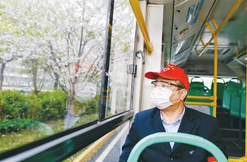 2020年3月25日,在武昌火車站綜合體站始發(fā)的首趟518路公交車上,安全員熊偉望著窗外路邊的櫻花。當(dāng)日起,武漢市部分公交車恢復(fù)開行。 新華社記者 沈伯韓/攝