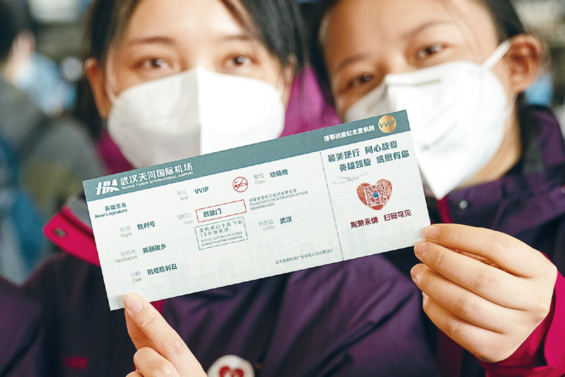 廣大醫(yī)務(wù)工作者是這次戰(zhàn)“疫”的“最大的功臣”。新冠肺炎疫情發(fā)生以來,29個省區(qū)市和新疆生產(chǎn)建設(shè)兵團(tuán)、軍隊(duì)等調(diào)派340多支醫(yī)療隊(duì)、42000多名醫(yī)務(wù)人員緊急馳援湖北。隨著防控形勢逐步向好,首批支援湖北國家醫(yī)療隊(duì)于2020年3月17日踏上返程之路。圖為兩名國家緊急醫(yī)學(xué)救援隊(duì)隊(duì)員展示武漢天河機(jī)場特別準(zhǔn)備的“勝利號”登機(jī)牌。 新華社記者 熊琦/攝