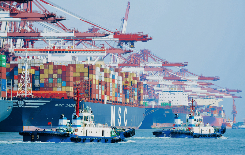 復工復產,交通運輸是“先行官”。港口在做好疫情防控的同時,積極加強物流運輸保障力度,提升運輸能力,確保外貿物流順暢運轉。圖為2020年2月19日,山東港口青島港外貿集裝箱碼頭,拖輪駛離泊位前往工作海域。 中新社記者 俞方平/攝