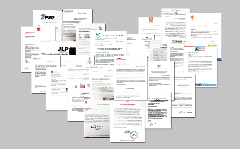 目前,已有130多個(gè)國(guó)家的300多個(gè)政黨和政治組織共600多人次向習(xí)近平總書(shū)記和中共中央發(fā)來(lái)電函或通過(guò)發(fā)表聲明、文章等表示慰問(wèn)支持。圖為部分政黨來(lái)函。 中共中央對(duì)外聯(lián)絡(luò)部供圖