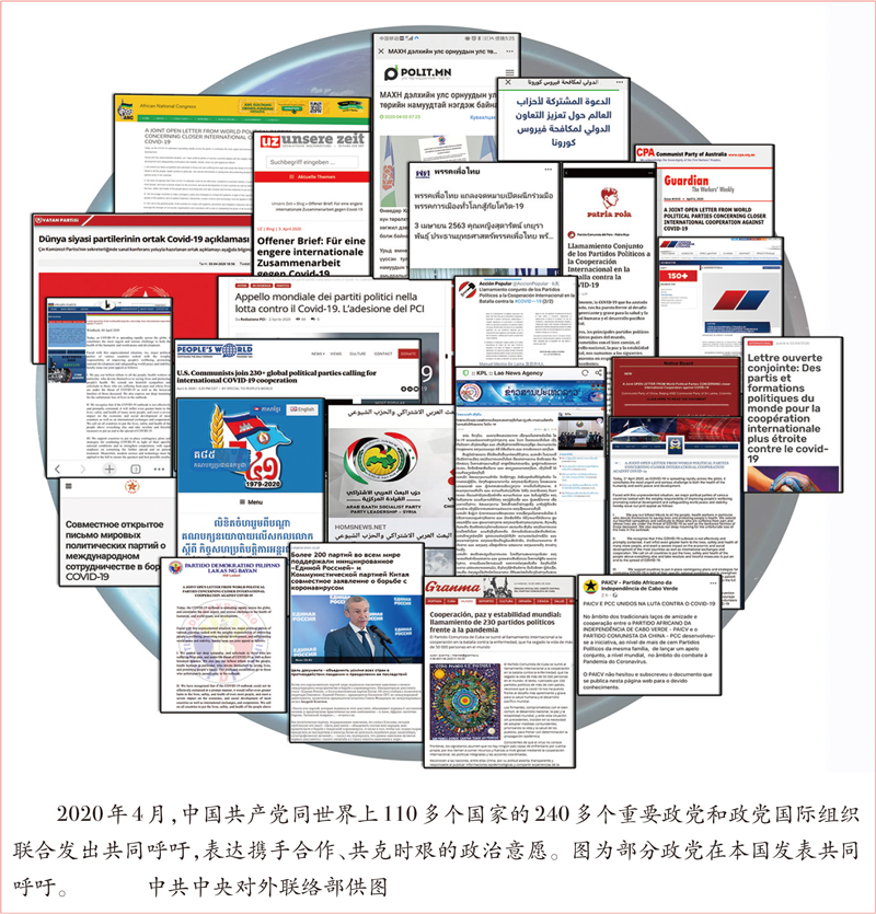 推動(dòng)世界政黨發(fā)出共同呼吁。習(xí)近平總書(shū)記指出,“重大傳染性疾病是全人類的敵人”,“新冠肺炎疫情再次表明,人類是一個(gè)休戚與共的命運(yùn)共同體”。我們黨依托國(guó)際政黨交流合作網(wǎng)絡(luò),引領(lǐng)各方深刻認(rèn)識(shí)到,面對(duì)新冠肺炎疫情全球蔓延,任何國(guó)家都無(wú)法獨(dú)善其身,只有攜手合作才能打贏這場(chǎng)戰(zhàn)役。習(xí)近平總書(shū)記親自與老撾人民革命黨中央總書(shū)記、國(guó)家主席本揚(yáng)等多國(guó)元首和政黨領(lǐng)導(dǎo)人通電話,強(qiáng)調(diào)“病毒沒(méi)有國(guó)界,不分種族,國(guó)際社會(huì)只有形成合力,才能戰(zhàn)而勝之”。在我們黨積極推動(dòng)下,世界上110多個(gè)國(guó)家的240多個(gè)重要政黨和政黨國(guó)際組織聯(lián)合發(fā)出共同呼吁,指出新冠肺炎疫情對(duì)人類衛(wèi)生健康及世界和平發(fā)展構(gòu)成最緊迫和最嚴(yán)峻的挑戰(zhàn),各國(guó)應(yīng)增強(qiáng)人類命運(yùn)共同體意識(shí),加強(qiáng)國(guó)際合作,相互支持和幫助,匯集全球的資源和力量,堅(jiān)決打敗病毒這一人類的共同敵人,堅(jiān)決反對(duì)將公共衛(wèi)生問(wèn)題政治化,呼吁各國(guó)把人民生命安全和身體健康放在第一位,并采取積極措施保護(hù)外國(guó)僑民、留學(xué)生的健康安全和合法權(quán)益。這是新冠肺炎疫情暴發(fā)以來(lái)世界主要政黨首次就國(guó)際抗疫合作發(fā)出共同聲音,成為世界政黨交往史上一件大事。與此同時(shí),推動(dòng)亞洲政黨國(guó)際會(huì)議和二十國(guó)集團(tuán)民間社會(huì)會(huì)議發(fā)表呼吁加強(qiáng)國(guó)際抗疫合作的共同倡議和聲明,表達(dá)了各方攜手合作、共克時(shí)艱的政治愿望,產(chǎn)生了良好的政治效果。