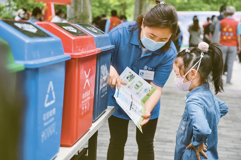 實(shí)行垃圾分類,關(guān)系廣大人民群眾生活環(huán)境,關(guān)系節(jié)約使用資源,也是社會(huì)文明水平的一個(gè)重要體現(xiàn)。圖為2020年5月23日,社區(qū)工作人員和志愿者走進(jìn)北京市東城區(qū)西花市南里東區(qū),舉辦垃圾分類宣傳活動(dòng),為社區(qū)居民講解垃圾分類知識(shí)。 新華社記者 彭子洋/攝
