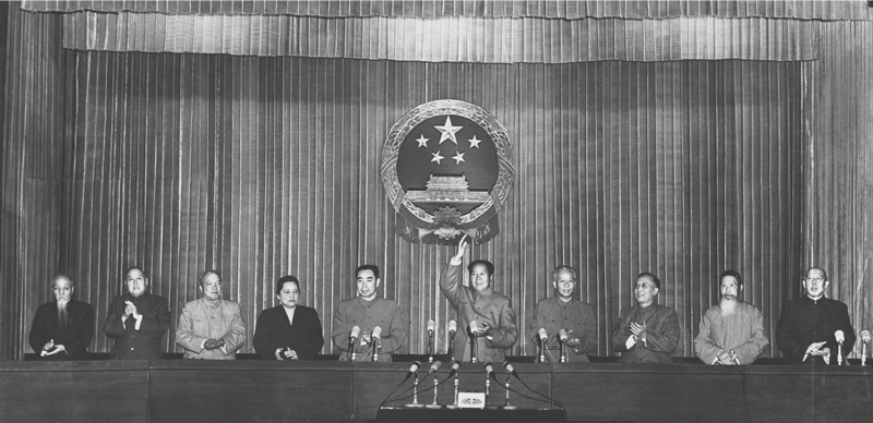 1954年9月15日至28日,第一屆全國(guó)人民代表大會(huì)第一次會(huì)議在北京舉行。劉少奇在關(guān)于憲法草案的報(bào)告中指出:中國(guó)共產(chǎn)黨是我們國(guó)家的領(lǐng)導(dǎo)核心;中國(guó)共產(chǎn)黨的黨員必須在遵守憲法和一切其他法律中起模范作用。會(huì)議通過(guò)了第一部《中華人民共和國(guó)憲法》,這部憲法肯定了中國(guó)共產(chǎn)黨領(lǐng)導(dǎo)中國(guó)人民走過(guò)的新民主主義革命道路,明確了中國(guó)共產(chǎn)黨在人民民主統(tǒng)一戰(zhàn)線中的領(lǐng)導(dǎo)地位。圖為毛澤東等在會(huì)議閉幕式主席臺(tái)。 新華社發(fā)