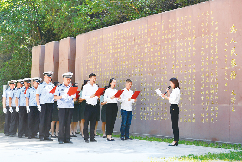 在中國共產(chǎn)黨成立99周年之際,革命圣地延安的黨員干部紛紛來到紅色景區(qū),舉行主題黨課、現(xiàn)場教學(xué)、重溫入黨誓詞等活動。 圖為2020年6月29日,在延安市張思德廣場,黨員干部在誦讀《為人民服務(wù)》。 新華社記者 張博文/攝