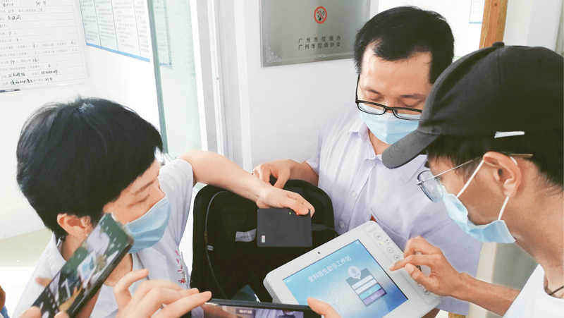 為提升基層醫(yī)療服務(wù)水平,花都區(qū)引入全新信息化管理平臺,2019年9月起試點為區(qū)內(nèi)基層醫(yī)生配備多功能巡診包。巡診包又稱“移動工作站”,可進行血壓、血糖、心電、尿酸、膽固醇等檢測,具有便攜性強、易操作、數(shù)據(jù)實時同步等特點,鄉(xiāng)醫(yī)可攜帶為村民開展入戶檢查,大大提高了工作效率。圖為儒林村駐村醫(yī)生向記者展示出診時隨身攜帶的多功能巡診包。 本刊記者 王兆斌/攝