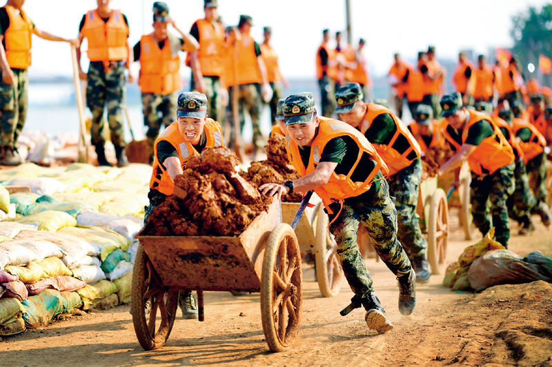 2020年7月以來,我國多地遭遇持續(xù)強降雨,發(fā)生嚴重洪澇災害。人民至上、生命至上。提前轉(zhuǎn)移、緊急營救、妥善安置……一場涉及上百萬群眾生命的生死競速就此拉開。圖為2020年7月17日,武警江西總隊機動支隊黨員突擊隊在江西省鄱陽縣鄱陽鎮(zhèn)昌江圩用推車將余土推到空地堆放。 新華社發(fā) 曹先訓/攝