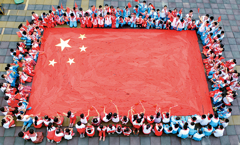 社會(huì)主義辦學(xué)方向是我國(guó)教育最鮮亮的底色,我國(guó)教育要培養(yǎng)的是社會(huì)主義建設(shè)者和接班人,這是個(gè)根本性的問題。圖為山東省沂源縣荊山路小學(xué)開展“紅領(lǐng)巾拼國(guó)旗祝福祖國(guó)迎國(guó)慶”活動(dòng),學(xué)生們?cè)诶蠋煄ьI(lǐng)下用紅領(lǐng)巾拼出了一面巨型國(guó)旗,表達(dá)對(duì)偉大祖國(guó)的祝福。 教育部供圖