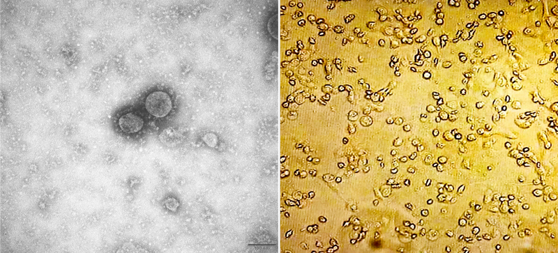2020年1月7日,我國科研團隊分離到新冠病毒并獲得電鏡照片。新型冠狀病毒屬于β屬的冠狀病毒,病毒顆粒表面分布有“皇冠”樣凸起,能夠與宿主細胞表面的特定受體結合,穿入細胞內部,完成轉錄、復制等生物學過程,新產生的病毒顆粒從細胞中釋放,再感染其他細胞。左圖是新冠病毒電鏡照片,右圖是新冠病毒復制導致的細胞病變。 科技部供圖