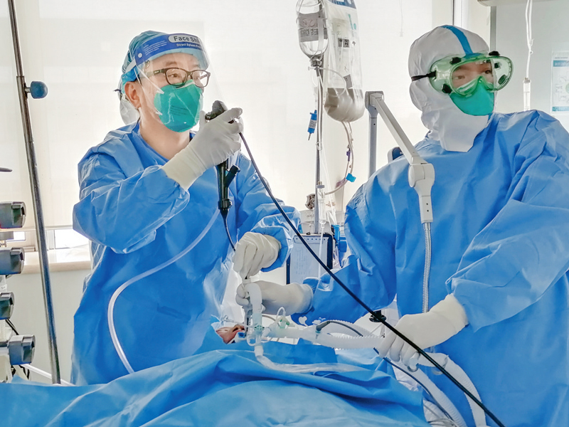 2020年7月16日,童朝暉(左)在北京地壇醫(yī)院為危重癥患者做氣管鏡。 新華社發(fā)