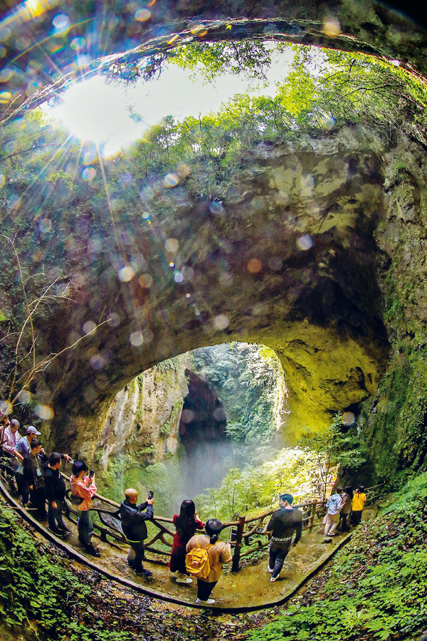 黨的十八大以來,我國生態(tài)文明建設(shè)取得歷史性成就,人民群眾生態(tài)環(huán)境獲得感、幸福感和安全感不斷增強(qiáng)。圖為2020年9月24日,游客在湖南省湘西世界地質(zhì)公園靈洞天坑里觀光游覽。 人民視覺供圖 曾祥輝/攝