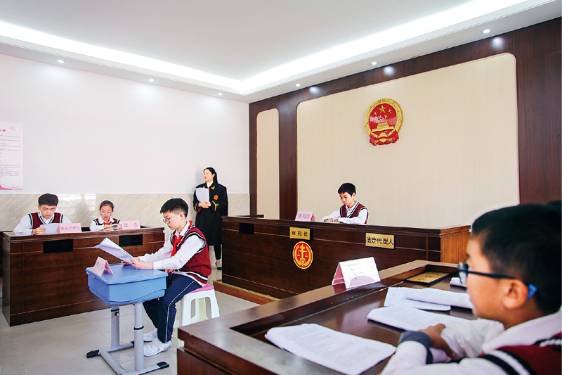 2020年10月30日,安徽省合肥市濱湖世紀社區(qū)在合肥師范附小三小開展“模擬法庭進校園”活動。圖為當日拍攝的模擬法庭“庭審”現(xiàn)場。 新華社記者 曹力/攝