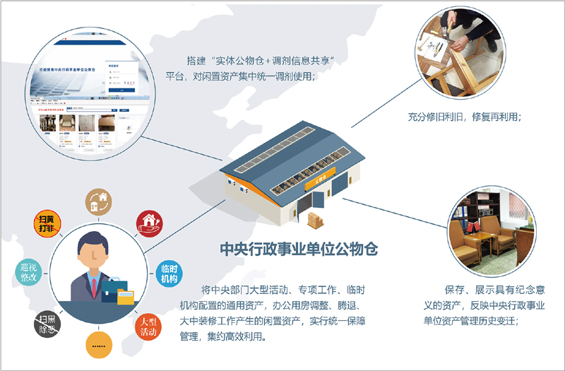 2020年以來,國家機關(guān)事務(wù)管理局積極推動中央行政事業(yè)單位公物倉試點工作。公物倉試點工作開展以來,國務(wù)院國資委、生態(tài)環(huán)境部等部門將本單位閑置的辦公設(shè)備家具近4000件納入示范倉管理,全國政協(xié)辦公廳、發(fā)展改革委等部門從公物倉調(diào)劑配備辦公設(shè)備家具700多件,節(jié)約資產(chǎn)購置經(jīng)費600余萬元。圖為中央行政事業(yè)單位公物倉運行模式和功能示意圖。 國家機關(guān)事務(wù)管理局供圖