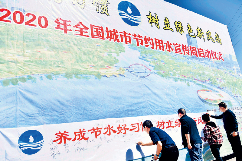 黨的十八大以來,機關(guān)事務(wù)部門建立健全黨政機關(guān)厲行節(jié)約制度體系和標(biāo)準(zhǔn)體系,組織開展節(jié)約型公共機構(gòu)示范單位創(chuàng)建,推動機關(guān)運行成本進一步降低,在全社會發(fā)揮了示范引領(lǐng)作用。圖為2020年5月12日,在江蘇省如皋市全國城市節(jié)約用水宣傳周啟動現(xiàn)場,市民在“養(yǎng)成節(jié)水好習(xí)慣,樹立綠色新風(fēng)尚”條幅上簽字。 視覺中國供圖
