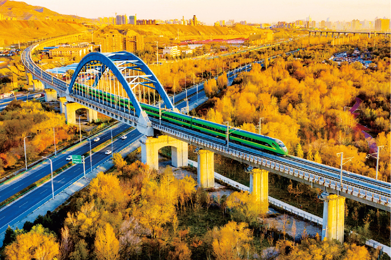 中國標(biāo)準(zhǔn)動(dòng)車組“復(fù)興號(hào)”是我國具有完全自主知識(shí)產(chǎn)權(quán)、達(dá)到世界先進(jìn)水平的動(dòng)車組列車,是我國制造業(yè)發(fā)展的世界名片。圖為2020年10月18日,一列復(fù)興號(hào)CR200J型電力動(dòng)車組列車迎著朝陽駛過烏魯木齊市燕兒窩段。 中新社記者 蔡增樂/攝