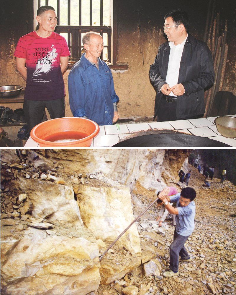上圖為2016年4月,黃詩燕(右一)在炎陵縣大坑村開展精準(zhǔn)扶貧工作調(diào)研(湖南省委宣傳部供圖);下圖為1999年9月,毛相林用鋼釬撬大石,帶領(lǐng)村民一寸寸鑿開出山公路(重慶市委宣傳部供圖)。